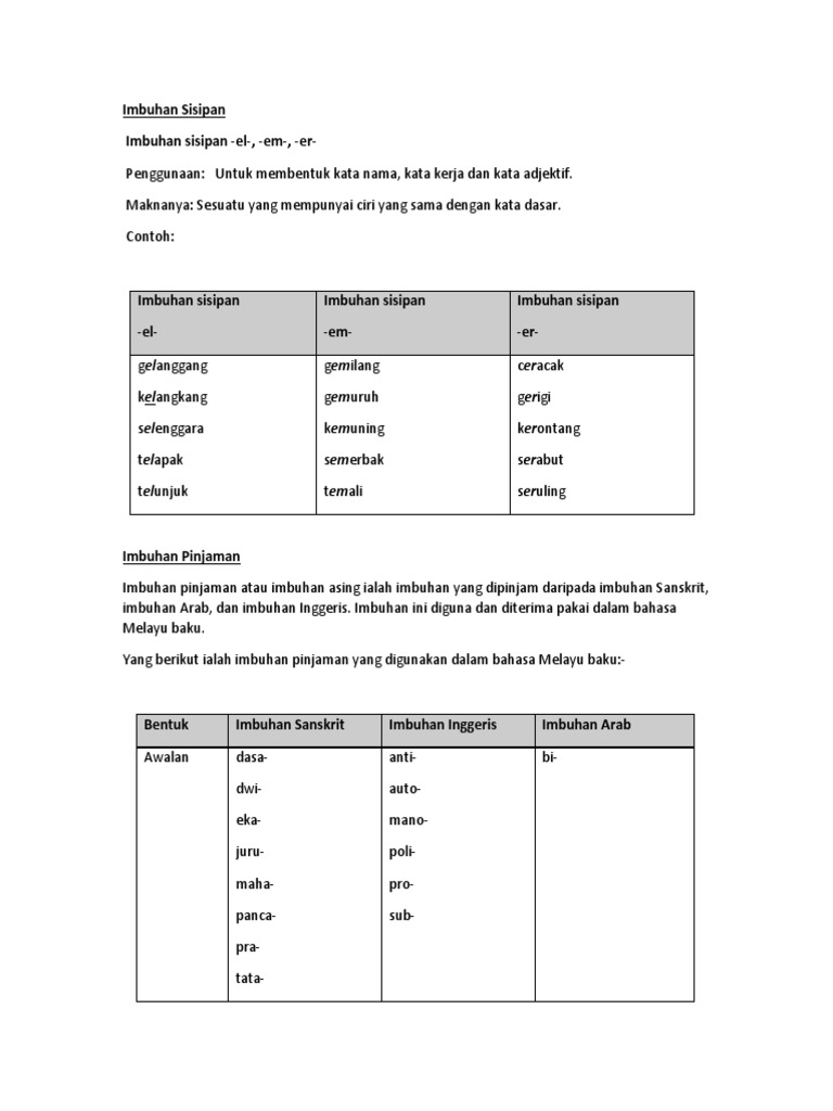 Imbuhan awalan Imbuhan akhiran Imbuhan apitan Imbuhan sisipan Imbuhan pinjaman Bertindak sebagai pelengkap kepada struktur ayat dari segi. Jika suatu kata terdiri atas lebih dari satu unsur dan salah satu unsur itu dapat bergabung. Imbuhan awalan yang dipakai.